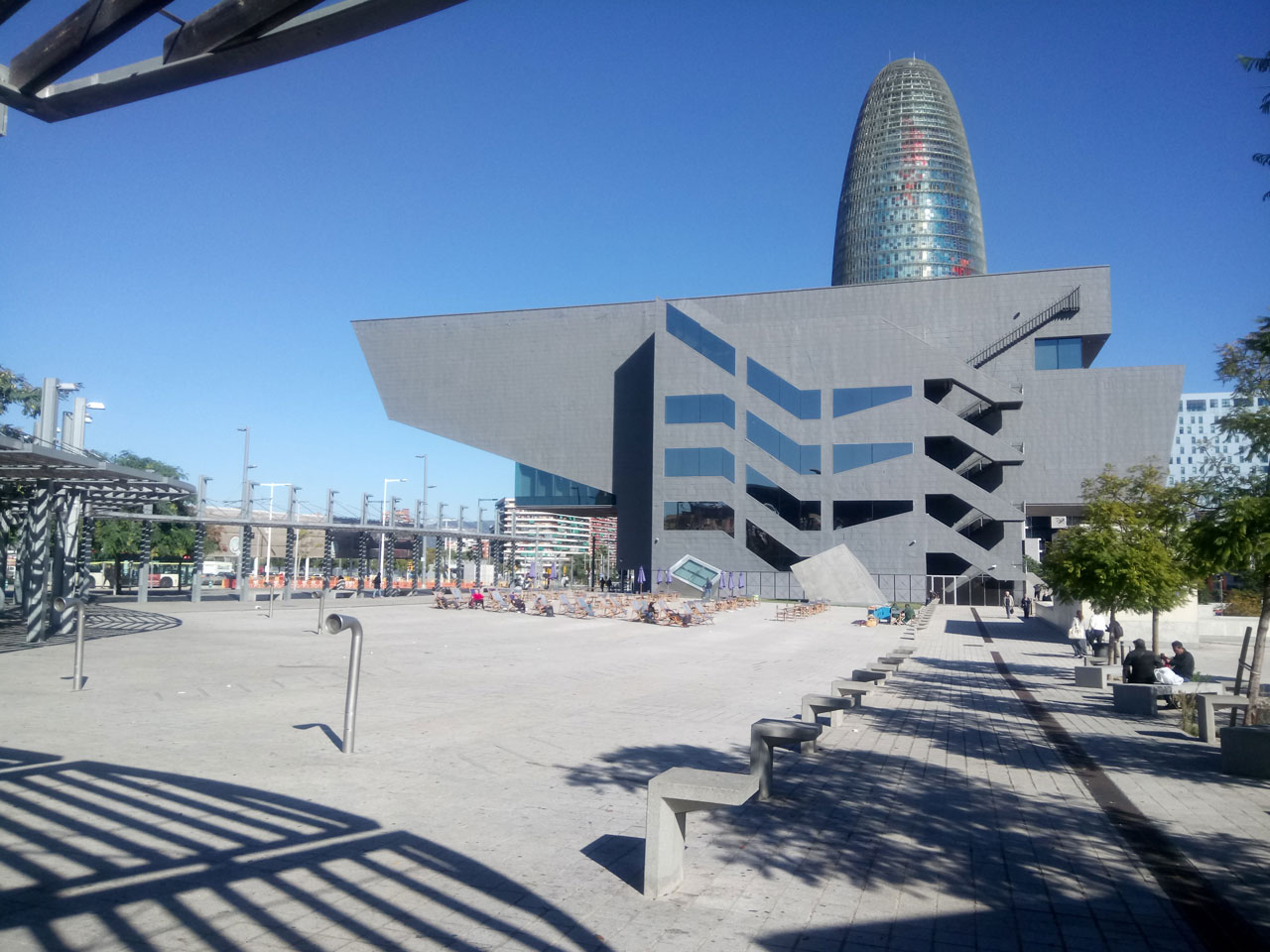 The Design Museum is located at The DHUB building in the Plaça de les Glòries was designed by MBM architecture firm, formed by Oriol Martorell, Oriol Bohigas and David Mackay. The Design Museum of Barcelona opened its doors in 2014. The building consists of two parts: an underground one (using the level change caused by the urbanization of the Glories square) and one that emerges 14.50 meters above the ground. The latter is a parallelepiped bias cut with the same width as the Avila Street, acting as an indicator of the relationship between the Eixample streets and the Glòries square, without affecting the view of the large central park. The cover of the subway is a public space linked to the future project of the Plaça de les Glòries park. The green carpet is one of the important components and it is made with natural or artificial elements to ensure sustainability and easy maintenance.
