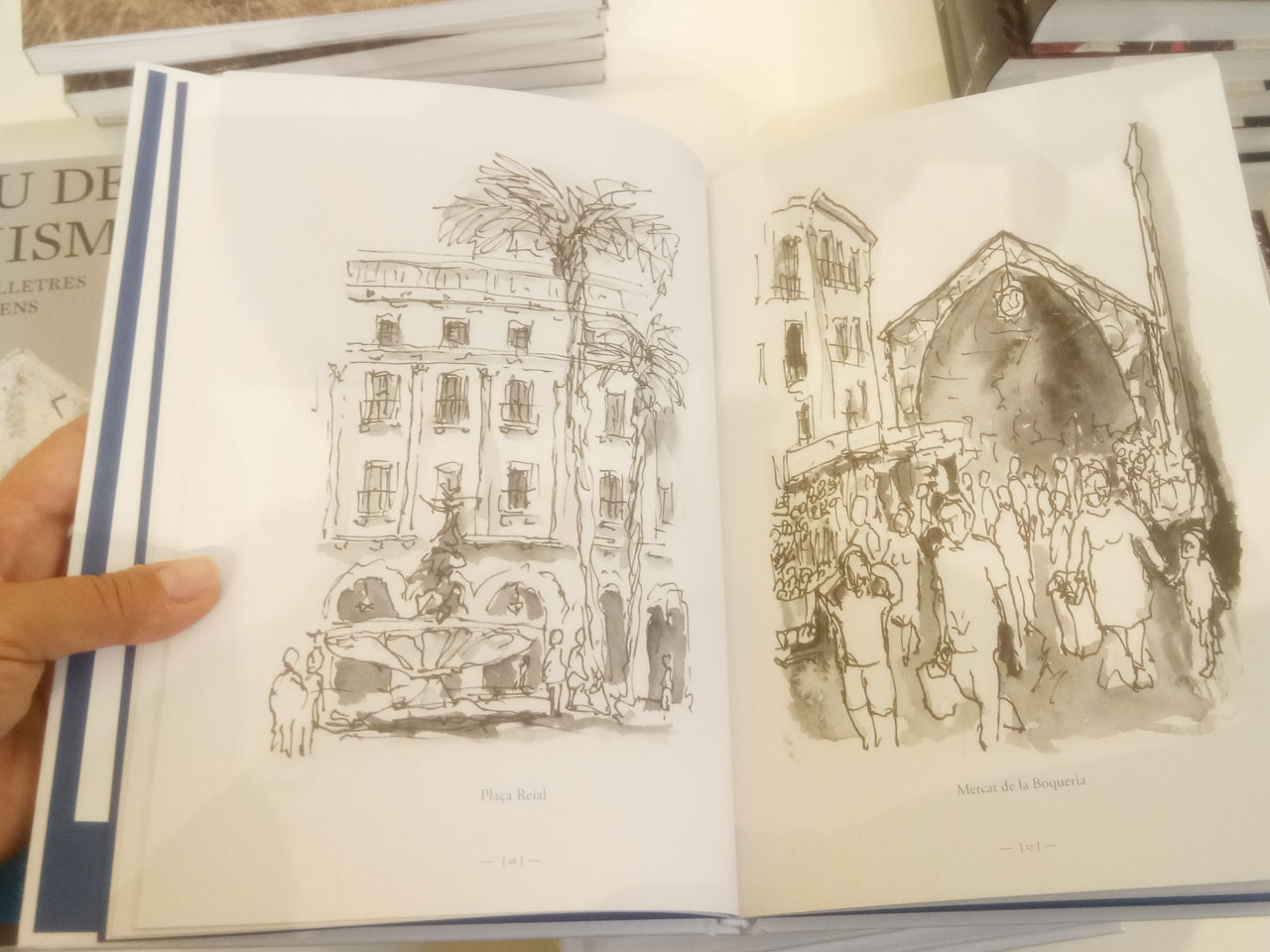 Barcelona La Ciutat Dibuixada is a collection of drawings by Catalan artist Gerard Rosés, depicting the main sites of the city. Here, there is Plaça Reial, on left, and La Boqueria Market, on right page.