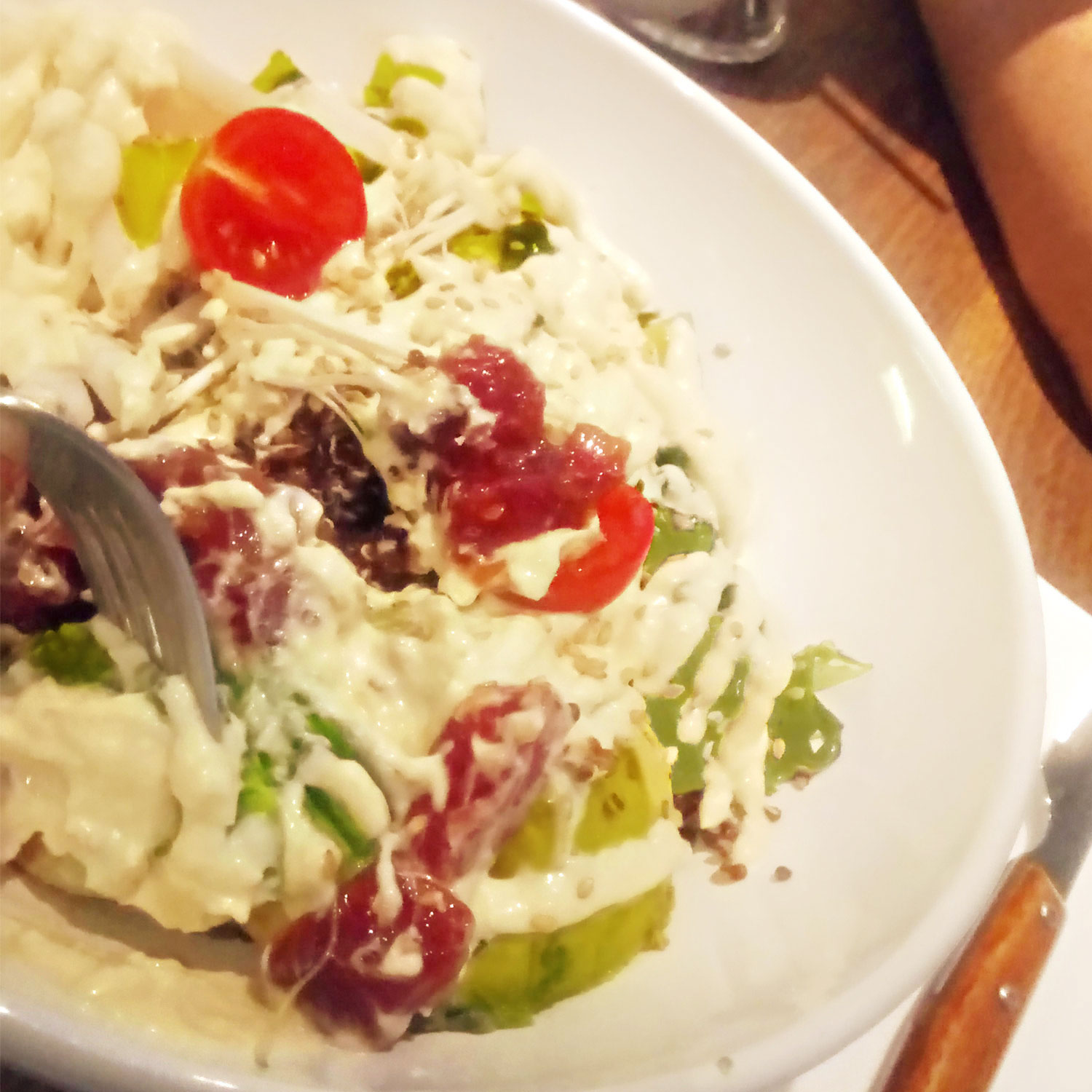 The dish includes red quinoa, daikon turnip, cucumber asazuke, yellowfin tuna sashimi, avocado, cherry tomato, wakame seaweed, enoki, sesame, coriander sprouts and miso-ginger dressing.
